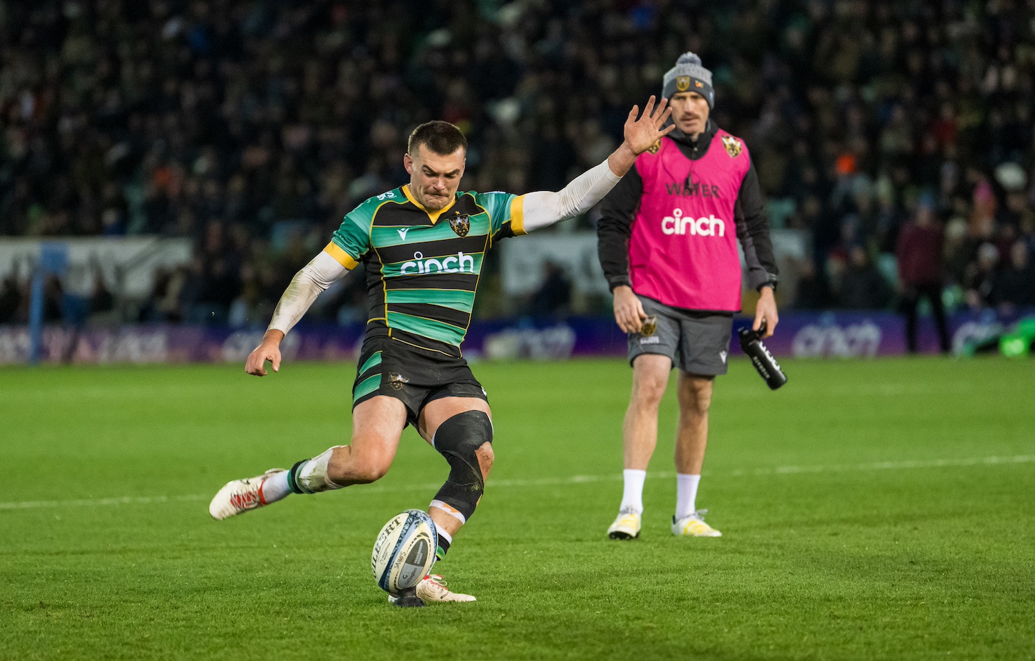 The 27-year-old inspired the men in Black, Green and Gold to a 36-33 win under the lights at cinch Stadium at Franklin’s Gardens, claiming the man-of-the-match award for an all-star showing on both sides of the ball.