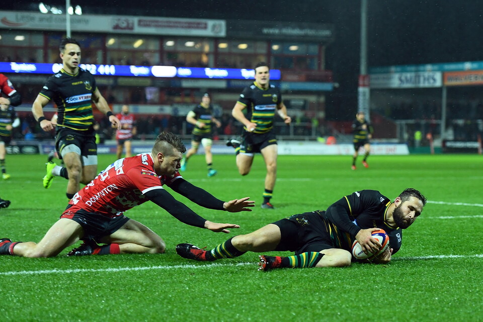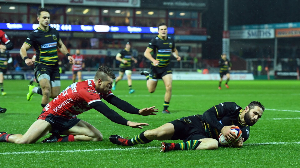 And Saints struck first with just five minutes on the clock, Francis exchanging a brilliant one-two with Furbank and then using his momentum on the greasy surface to slide over the whitewash, despite the attempts of two Gloucester defenders to stop him.