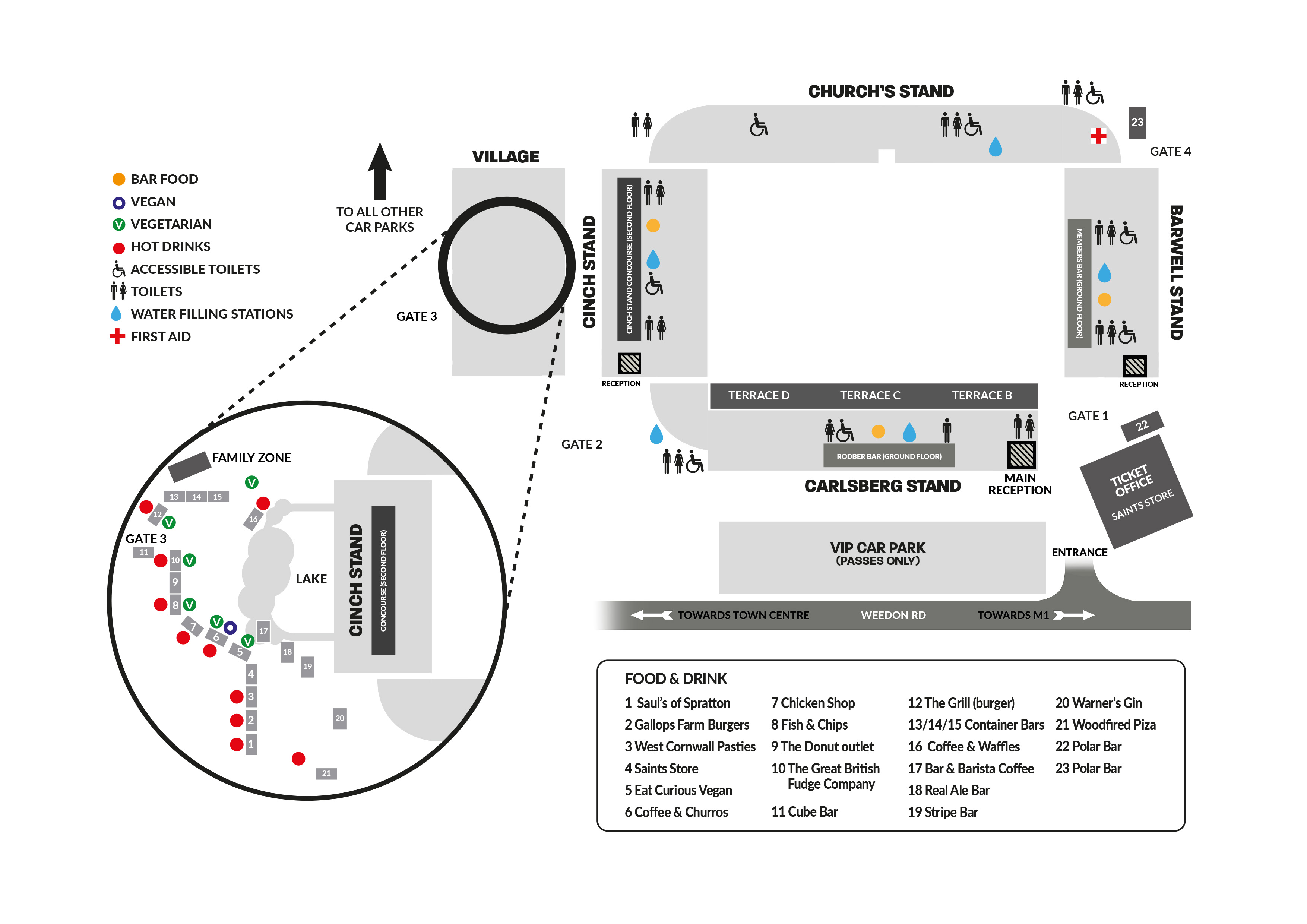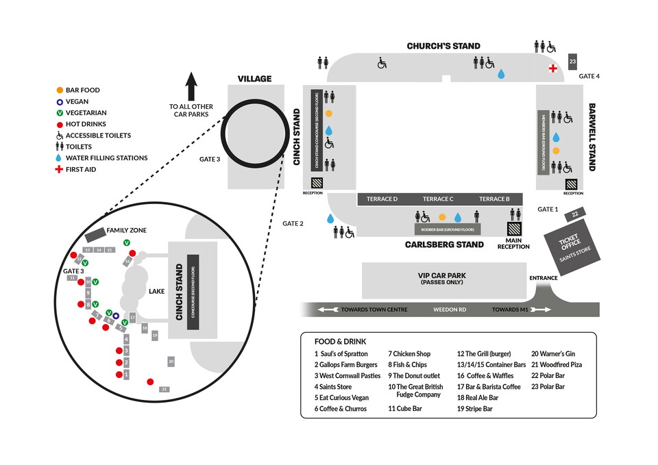 - A wide selection of bars and food stalls are open within the Village and stadium throughout matchday – please see the map above for full details of all the Food & Drink outlets around the Stadium.