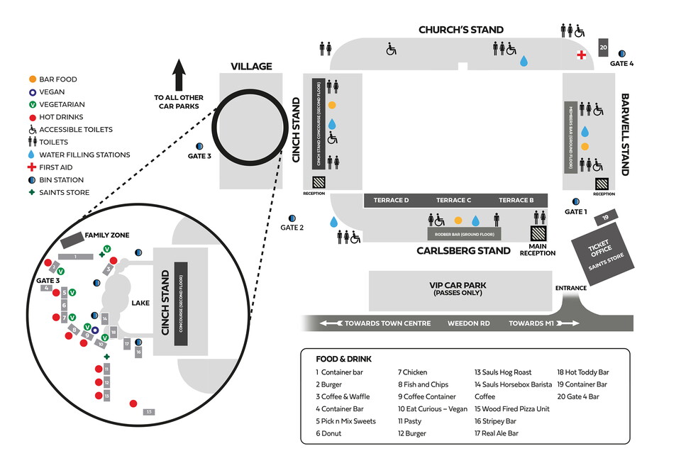 - A wide selection of bars and food stalls are open within the Village and stadium throughout matchday – please see the map above for full details of all the Food & Drink outlets around the Stadium.