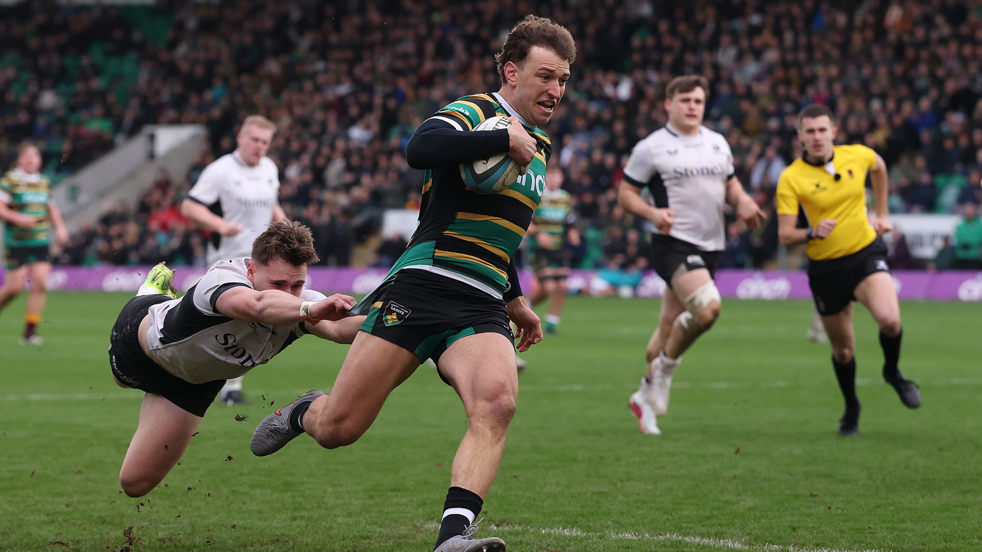 With the scores at 14-26, Saints unloaded their bench and they were back on the scoreboard instantly. Now-captain Munga scooped up a bouncing ball in the midfield and galloped free, reaching over the whitewash for Northampton’s third.