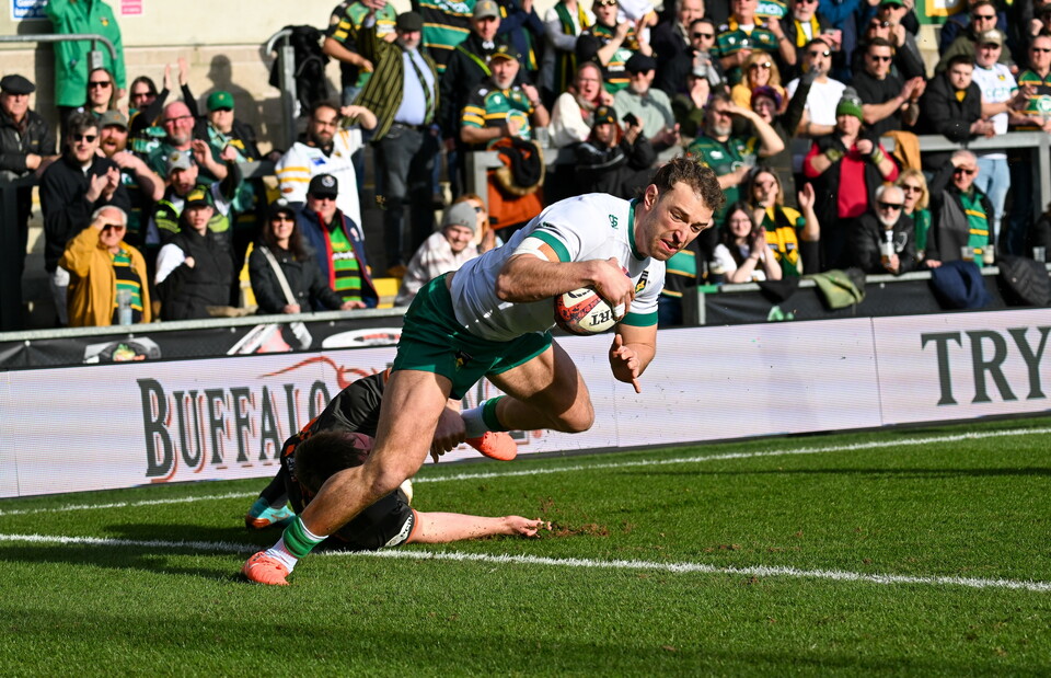 Saints struck back with their first foray into the attacking 22. From a thrice reset scrum, Rory Hutchinson teased the defence and teed up Hendy to roll over and finish for his eighth try in 12 games this season.