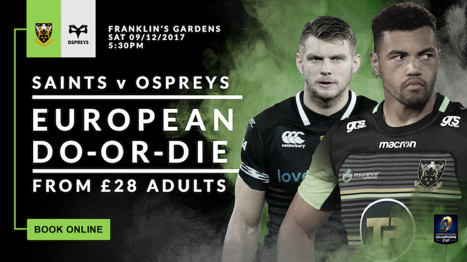 The Saints are back at home on Saturday 9 December for the second of back to back Gardens games, this time in the Champions Cup against Ospreys (KO 5:30pm).