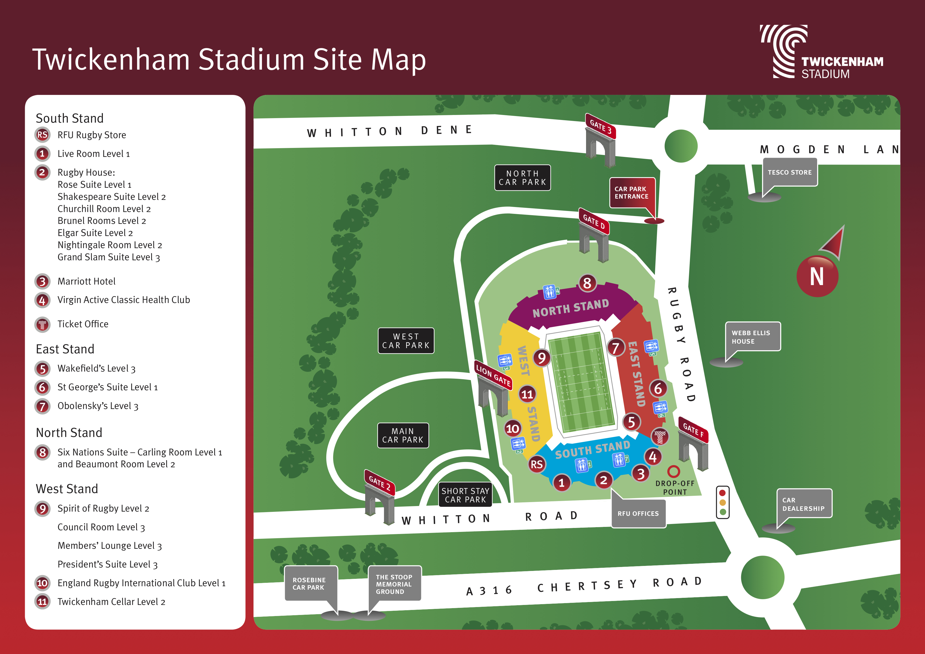 Twickenham Stadium is on the northern side of the A316 into London. From the M25, exit J12 onto the M3. This becomes the A316 and Twickenham Stadium is off the Whitton Road roundabout next to the Lexus/Toyota car dealership. From London, turn right off the A316 at Whitton Road roundabout. Please arrive early to avoid congestion and temporary road closures prior to the event.