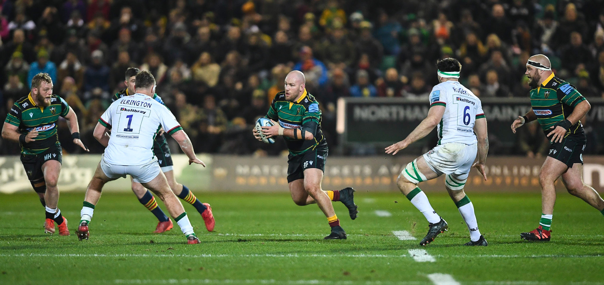 That became a theme for the first ten minutes, with lots of kicks on both sides sent up into the dark Northampton skyline in a very physical content – with both Franks brothers, Ben and Owen, making their presence felt with some colossal hits in midfield.