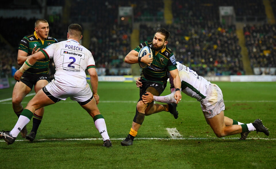 The visitors won the restart and looked threatening again, but more desperate defence from Northampton’s tight five forced a knock on from Cowan right on the tryline.