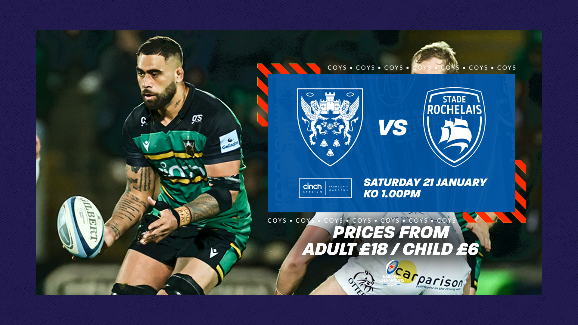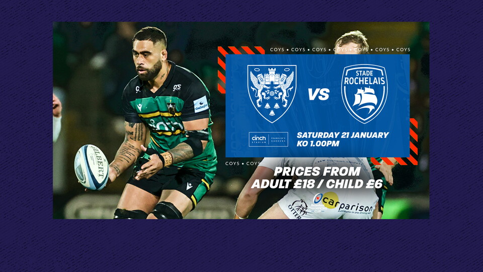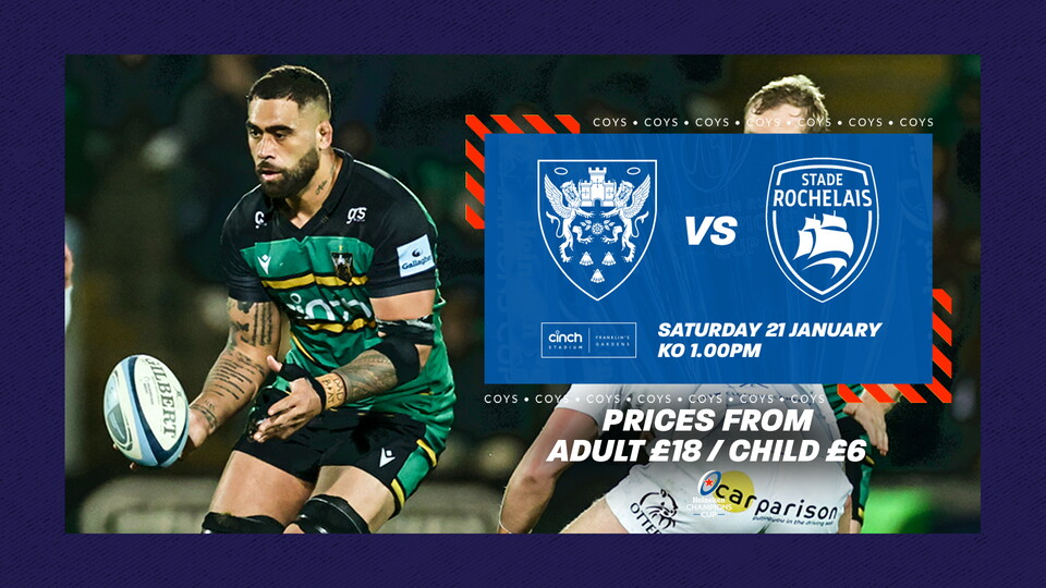 Tickets are now on sale for Northampton Saints’ Heineken Champions Cup clash against Stade Rochelais, with the match set to take place on Saturday 21 January (kick-off: 1pm) at cinch Stadium at Franklin’s Gardens.
