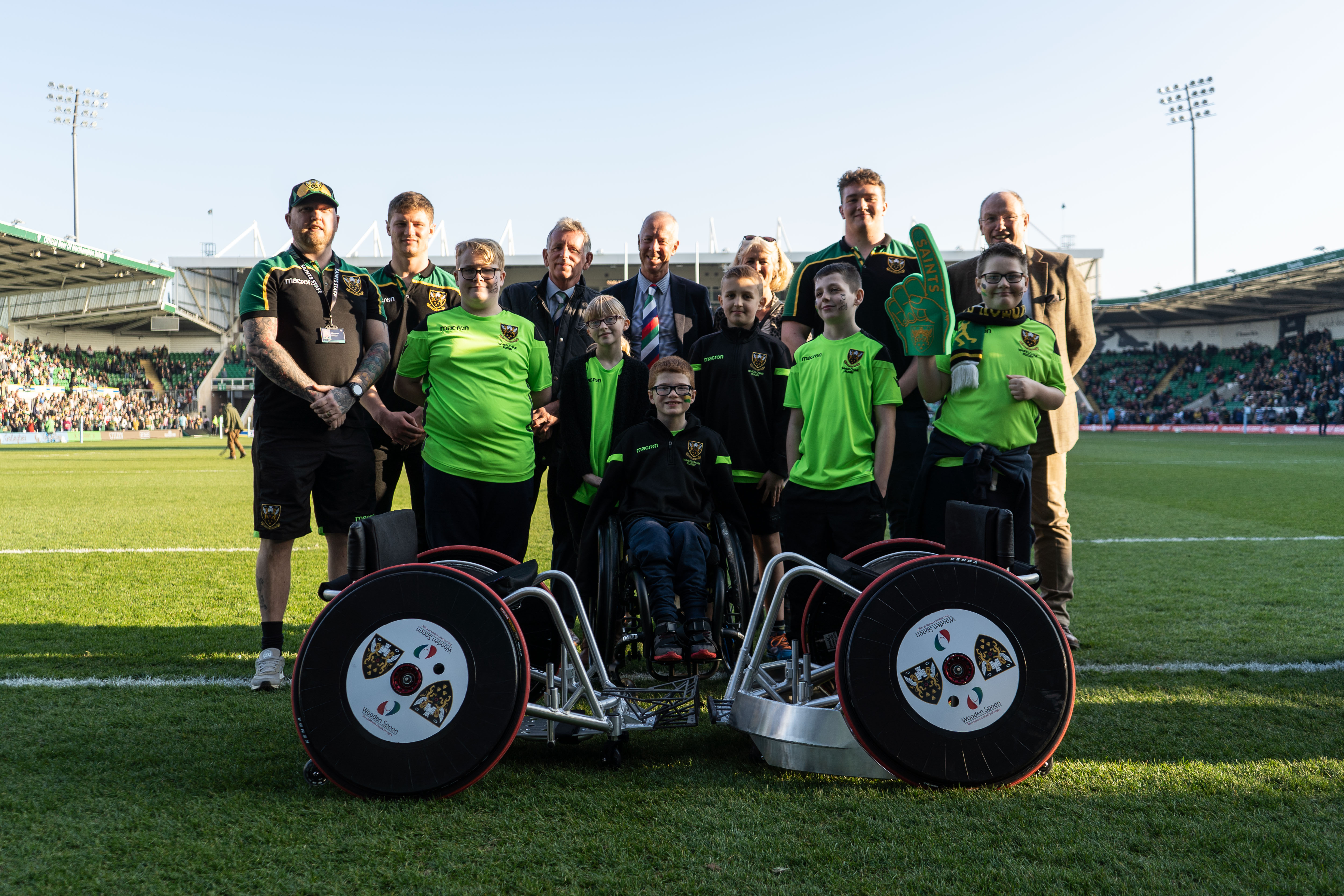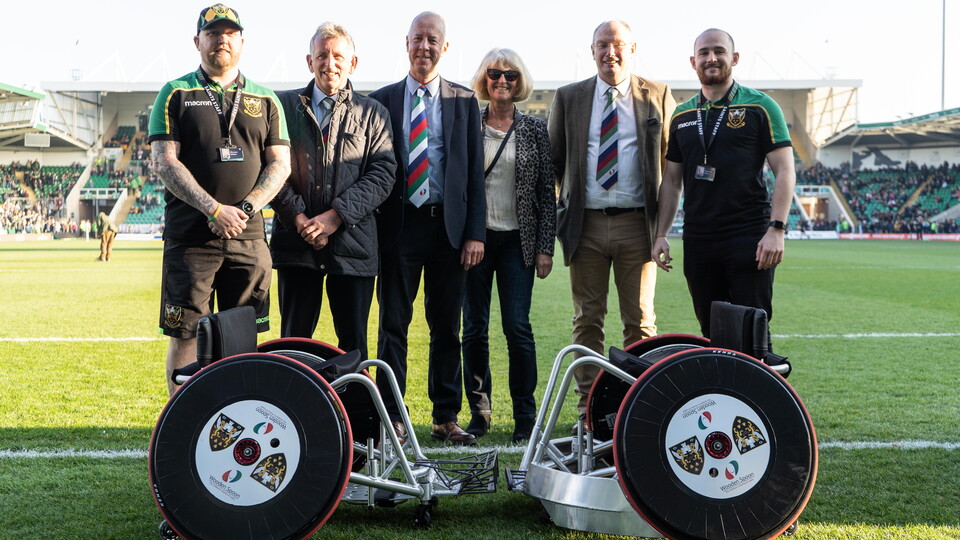 The Club was presented with the new wheelchairs at half-time of Northampton Saints’ home match against Bath Rugby (on Saturday 23 February) by Chris Fountain, chairman of Wooden Spoon Northamptonshire.