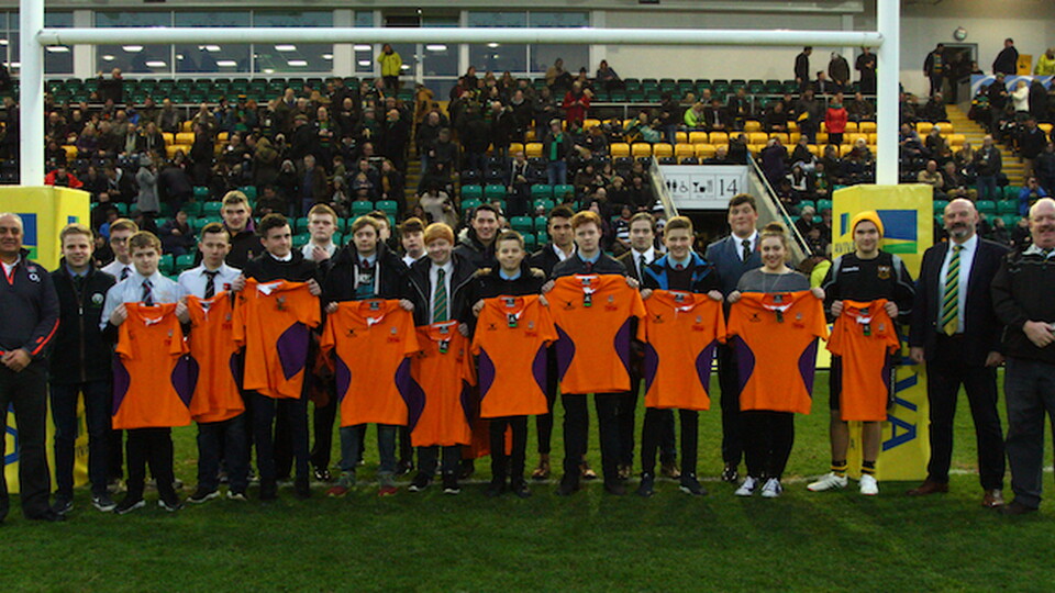 Young referees from the East Midlands were centre stage at Franklin’s Gardens at the start of the New Year, as nine teenagers from the Northampton Saints Developing Player Programme received their referee shirts during the half-time interval of the Saints’ Aviva Premiership game against Bristol.